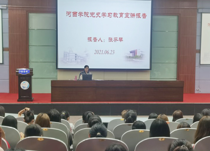 6月23日下午,776net必赢官网党总支书记张芬琴以“中国共产党的精神谱系”为题,在图书馆报告厅为200多名师生作了的党史学习教育宣讲报告。