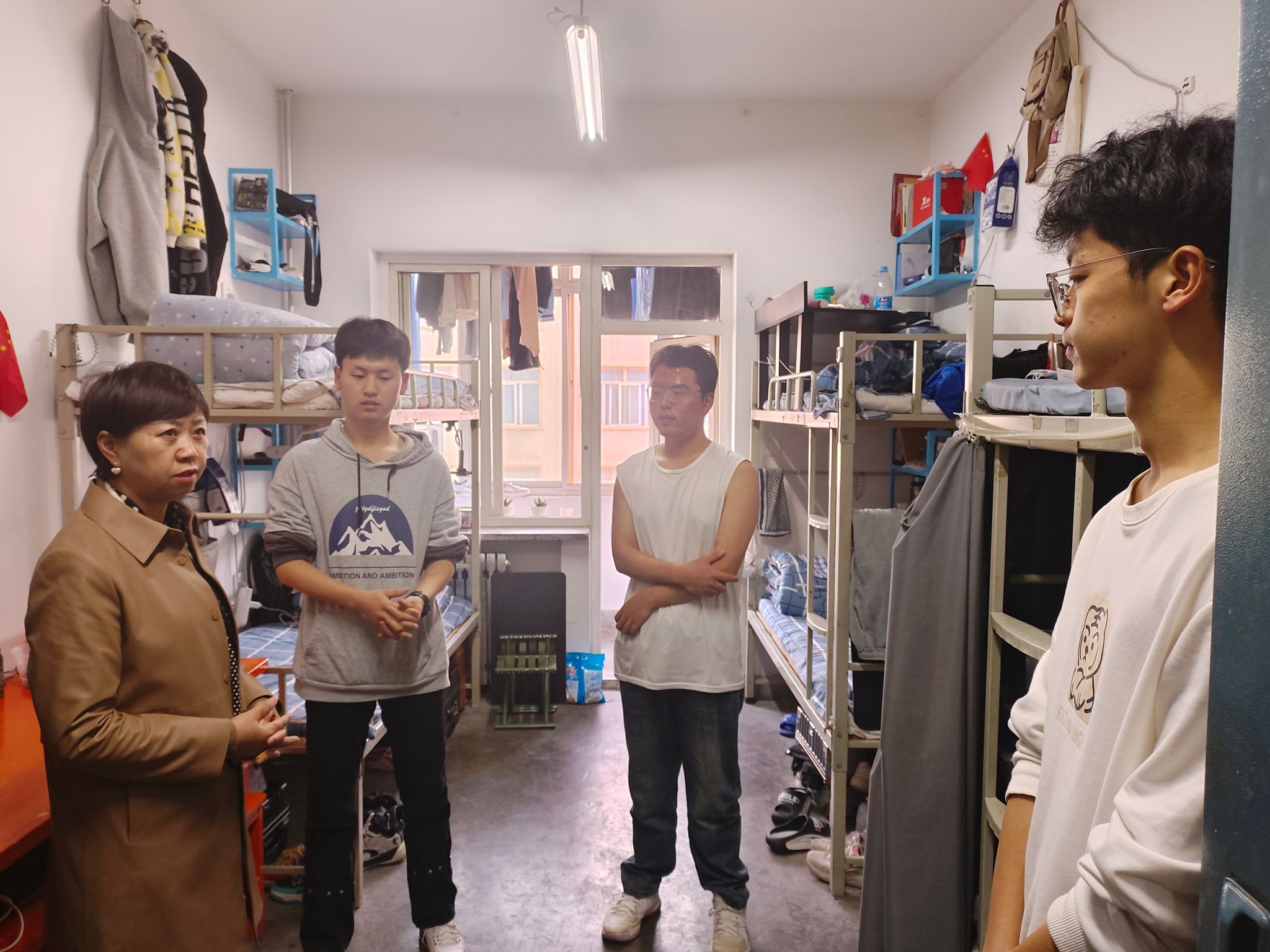 在宿舍,老师们仔细检查了宿舍内的电器电源设备、有无使用大功率电器等情况,叮嘱同学们要增强安全防范意识,注意宿舍用电安全,防范各类安全隐患,共同维护校园安全稳定。同时,对宿舍卫生状况进行了全面检查,鼓励同学们积极营造整洁、舒适的居住环境,对存在卫生问题的宿舍提出了整改要求,引导同学们养成良好的卫生习惯。在走访过程中,老师们与同学们亲切交流,深入了解他们在学习、就业、考研等方面的困惑和需求,鼓励大家明确学习目标,勤奋学习,掌握扎实的专业知识,积极参与科研和社会实践活动,全面提升综合素质;激励考研上线同学多与导师沟通,坚定信念,认真充分准备复试;向就业学生分析当前就业形式,鼓励大家增强就业信心,转变就业观念,提升就业竞争力,把握机遇积极主动就业创业。