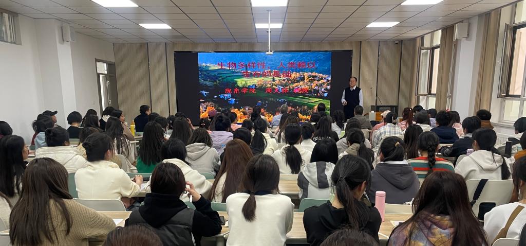 报告会上,周天林教授围绕生物多样性研究的重要意义、生物多样性的价值以及陇东地区生物多样性资源保护和利用等方面做了报告,倡导师生共同参与到生物多样性保护的行动中来,从我做起、人人参与,让保护环境、保护生物多样性成为师生的行动自觉。同时,他分享了自己带领团队克服各种难以想象的困难,坚持从事教学科研工作和生物资源保护利用研究,取得了丰硕的成果,引导同学们要做一个心中有理想,脚下有力量的人。这既是一场精彩的学术报告,更是一堂生动的思政课。