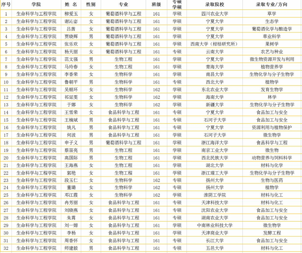 2020年,学院有毕业生136人,其中57人报考了“双一流大学”的一流大学建设和一流学科建设等高校的硕士研究生,报考率为41.91%;上线人数35人,上线率61.40%;除3人因特殊原因自动放弃被录资格外,其余32人均被录取,录取率91.42%。其中,2人分别被一流大学建设高校云南大学和新疆大学录取,15人分别被西北大学、西南大学和南昌大学等一流学科建设高校录取,被“双一流大学”录取的录取率为54.29%,所录学校分布于华南、华西、华东、东北和西北各区共16个省份。